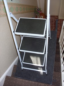 Tischlerarbeiten, Handwerk. Einsatz mit Hymer Treppenstehleiter auf Wendeltreppe von Lieber Leihen in Hamburg gemietet. Leiter für das Treppenhaus , steht in Sekunden auf jeder Treppe , Teleskopleiter mit stufenlos.